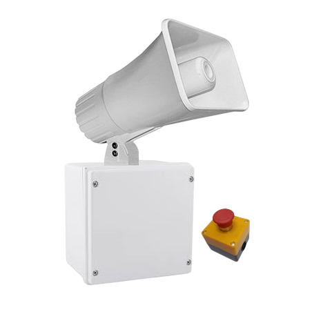Sirena Alarma Unidireccional para Interiores, Sirena acústica de cono, 30 - 50 W, con 120 DB, 110 Voltios, Botón de pánico, alcance de sonido 180 metros, ideales para pasillos y corredores.