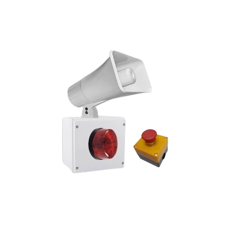 Sirena Alarma Unidireccional para Interiores, Sirena acústica de cono, 30 - 50 W, con 120 DB, 110 Voltios, Botón de pánico, alcance de sonido 180 metros, ideales para pasillos y corredores.